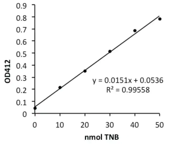 | Principle【原理】 | 在该测定中,髓过氧化物酶催化次氯酸的形成,次氯酸与牛磺酸反应形成牛磺酸氯胺。牛磺酸氯胺与发色团 TNB 反应,形成无色产物 DTNB。一个单位的髓过氧化物酶活性定义为在 25℃ 下,每分钟水解底物并产生牛磺酸氯胺以消耗 1.0 μmole TNB的酶量。 |
